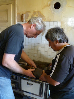Ook erg fijn dat mijn zus en haar man in het hele huis puin hebben geruimd (in de week hiervoor) en al het stookhout hebben verzameld. Dat komt goed uit want Stephan was bij binnenkomst al gefascineerd door kacheloven in de keuken, iets dat hij nog kent uit zijn jeugd. De kachel moest aan, maar de schoorsteen was nog niet aangesloten en het ding staat te laag voor de lange Nederlanders. Als eerste regelen we wat stenen bij de overburen om de kachel 15 cm hoger te kunnen zetten. Stefan zaagt de schoorsteenbuis op maat en maakt de kachel helemaal schoon. Dan kan de fik er in! Een magisch moment, voor het eerst sinds jaren komt er weer rook uit de schoorsteen. Nu maar houthakken, stukjes van 20 cm.